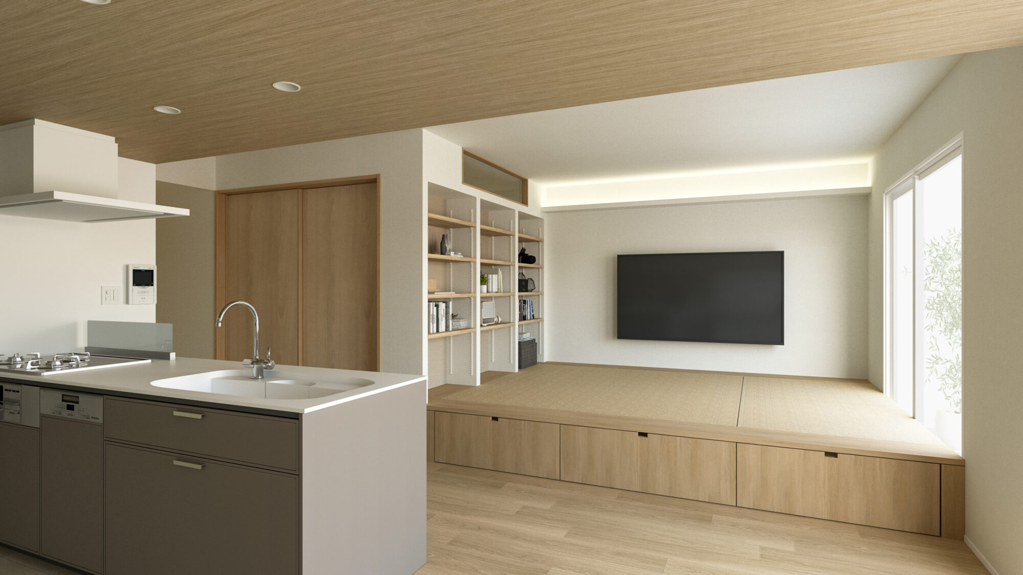 開放感あふれるペニン シュラキッチンと、デスク を備えた背面収納。フロン トオープンの食洗機付き。2 畳の小上がりは、気まま にごろりとくつろげる安 らぎのスペース。畳下に は大容量の収納を計画。