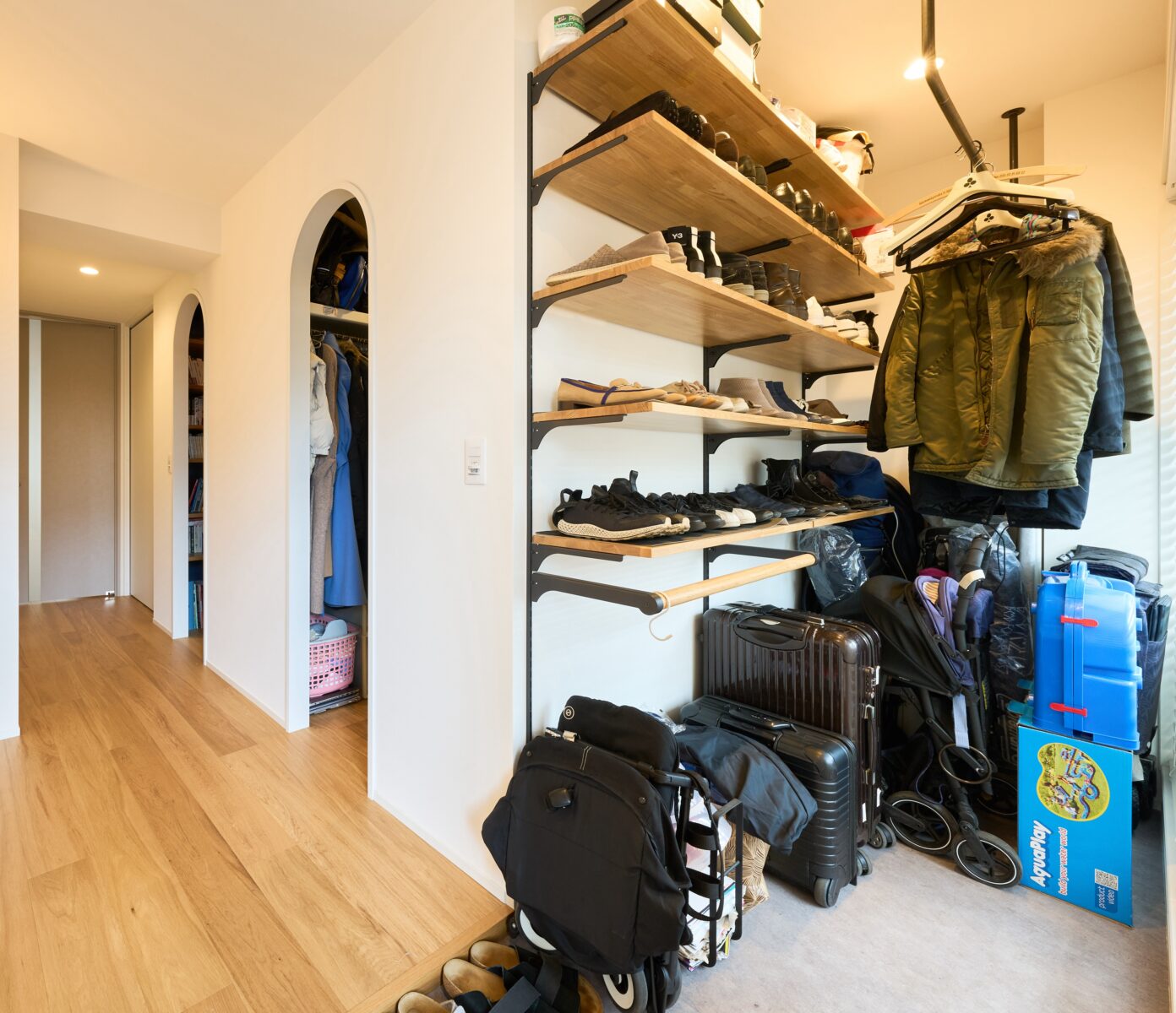 靴はもちろん、アウトドア用品やベビー カーも収納できる玄関横の土間。汚れ を気にせず外で使う物を持ち込めて、 暮らしが快適になります。