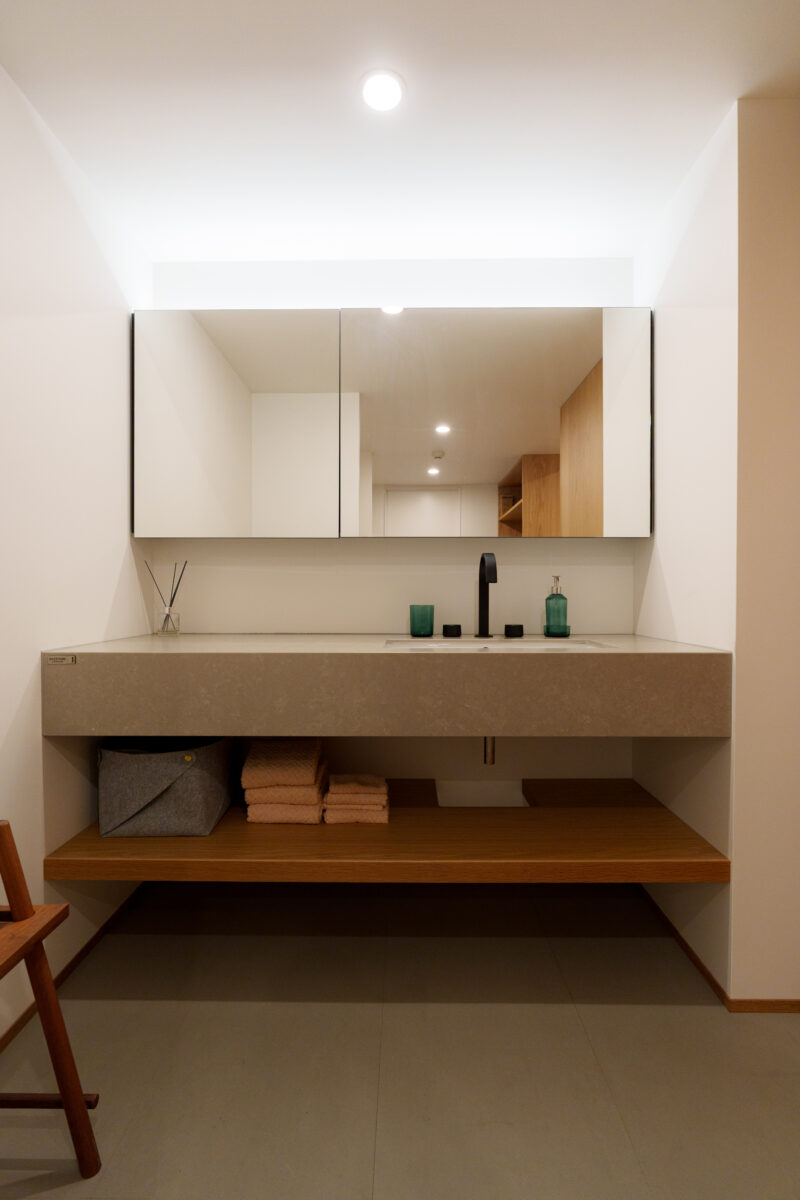 家族もゲストも使いやすいセミオー プン洗面。裏動線で家事をスムーズに し、洗濯機を隠せる脱衣スペースで、 空間をすっきり整えます。