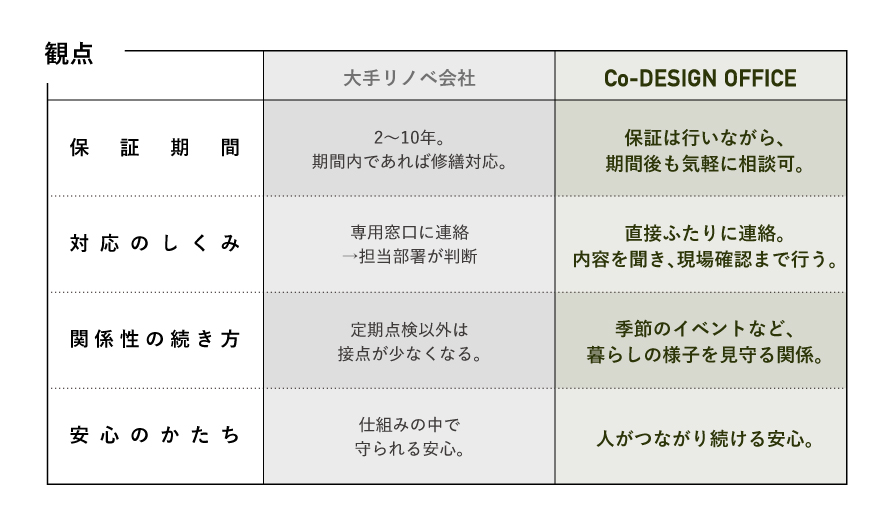 下の表は、大手リノベーション会社と小規模なリノベーション会社の、リノベーション後の「サポートの続き方」を比べたものです。仕組みとしての保証と、人としての関係。その違いが、「暮らしの安心」を変えていきます。
